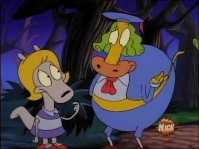 Back to the story, the two children end up on the ground and come across the witch once again. They run away and take the elevator to wherever they end up at, only for the witch to arbitrarily appear in their presence. When they take the elevator, Rocko presses the “Cinderella“ button and the evaluator takes Rocko, and Heffer to Cinderella's story, they encounter a fairy (also portrayed by Filburt), who turns Rocko into a prince and Heffer into a princess, calling himself CinderHeffer. The fairy also offers the two a coach and they ride away, only to end up back in the woods, where they once again encounter the witch. The witch offers them a blue apple, which CinderHeffer instantly bites off of, a bubbly beverage, which CinderHeffer drinks the whole glass of. When the witch offers a glowing breath mint, CinderHeffer places it on his tongue and turns into a wooden puppet. Rocko and the other animals sadly circle around the puppet, and the witch sneaks back to the broom, attempting to escape, only to get subsequently crushed by numerous of ponderous objects. When Rocko notices the witch's glass slippers sticking out, he takes them and puts it on the feet of CinderHeffer, bring him back to life. The prince and CinderHeffer get married and lived happily ever after.